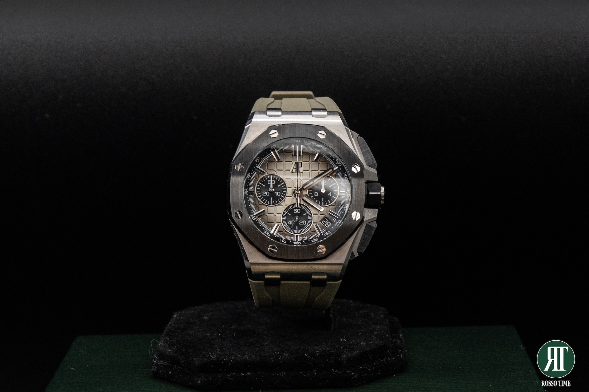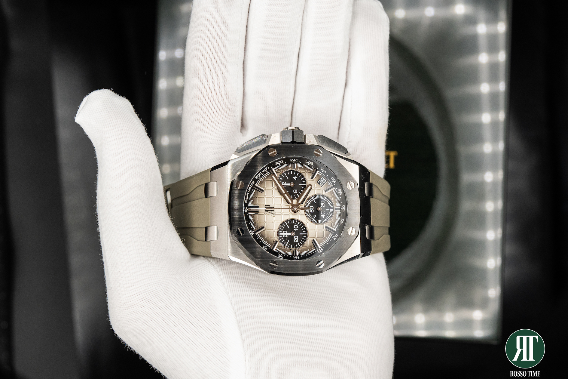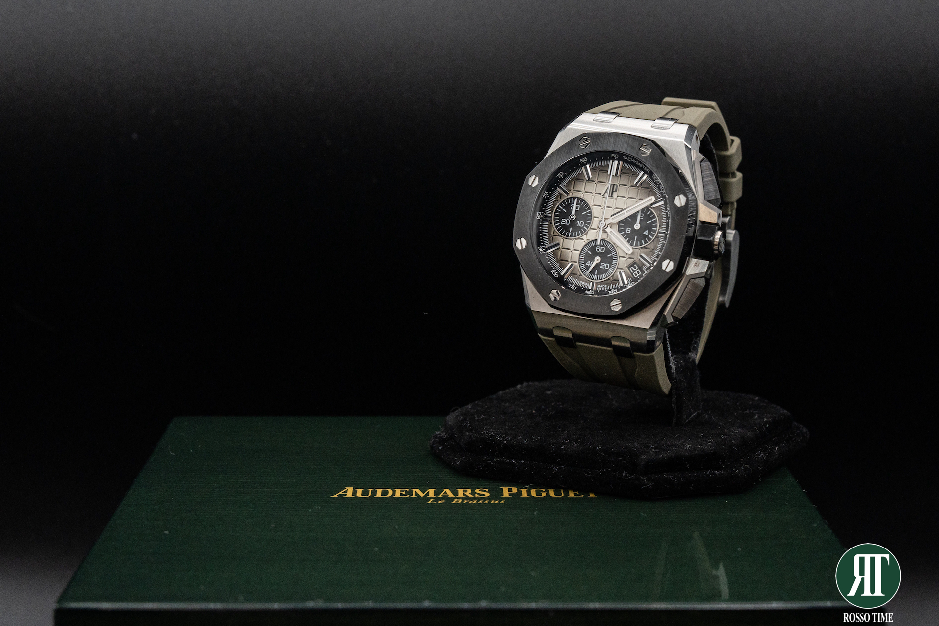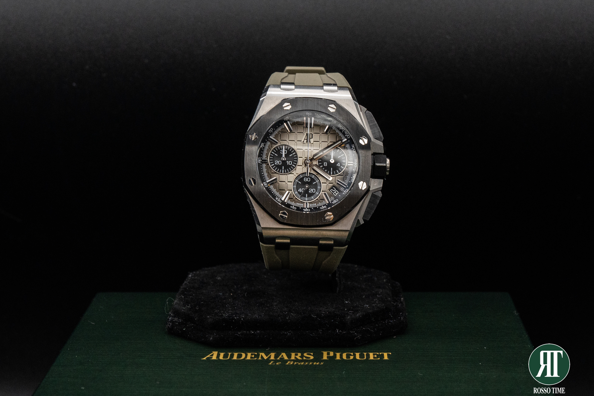 For sale this incredible Audemars Piguet Royal Oak Offshore watch, purchased in Genova in 2021. This Swiss made watch has an iconic design with an octagonal bezel and steel case. The brown embossed dial contains luminescent indexes and is protected by a sapphire crystal. The brand’s logo can be seen at the top. The strap is made of brown rubber and has a steel buckle clasp. The condition of the watch is impeccable, it has never been worn. It comes with its box and documents, and includes the brand’s official guarantee.