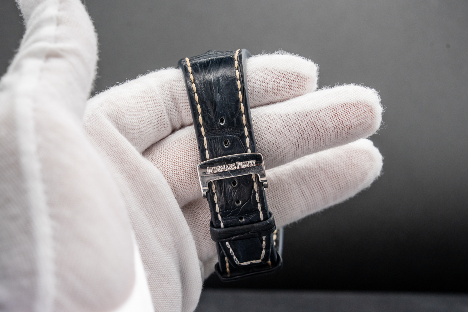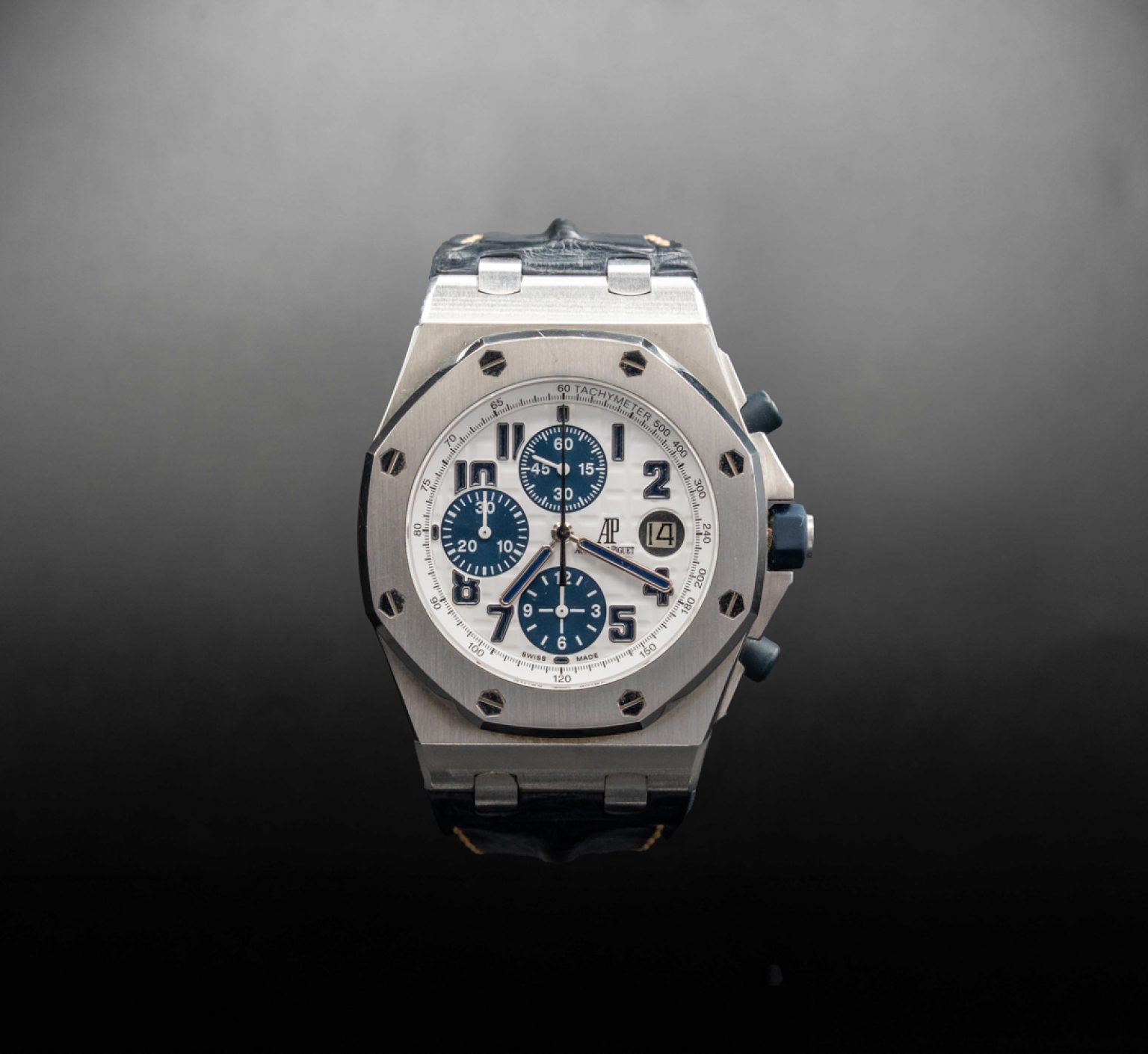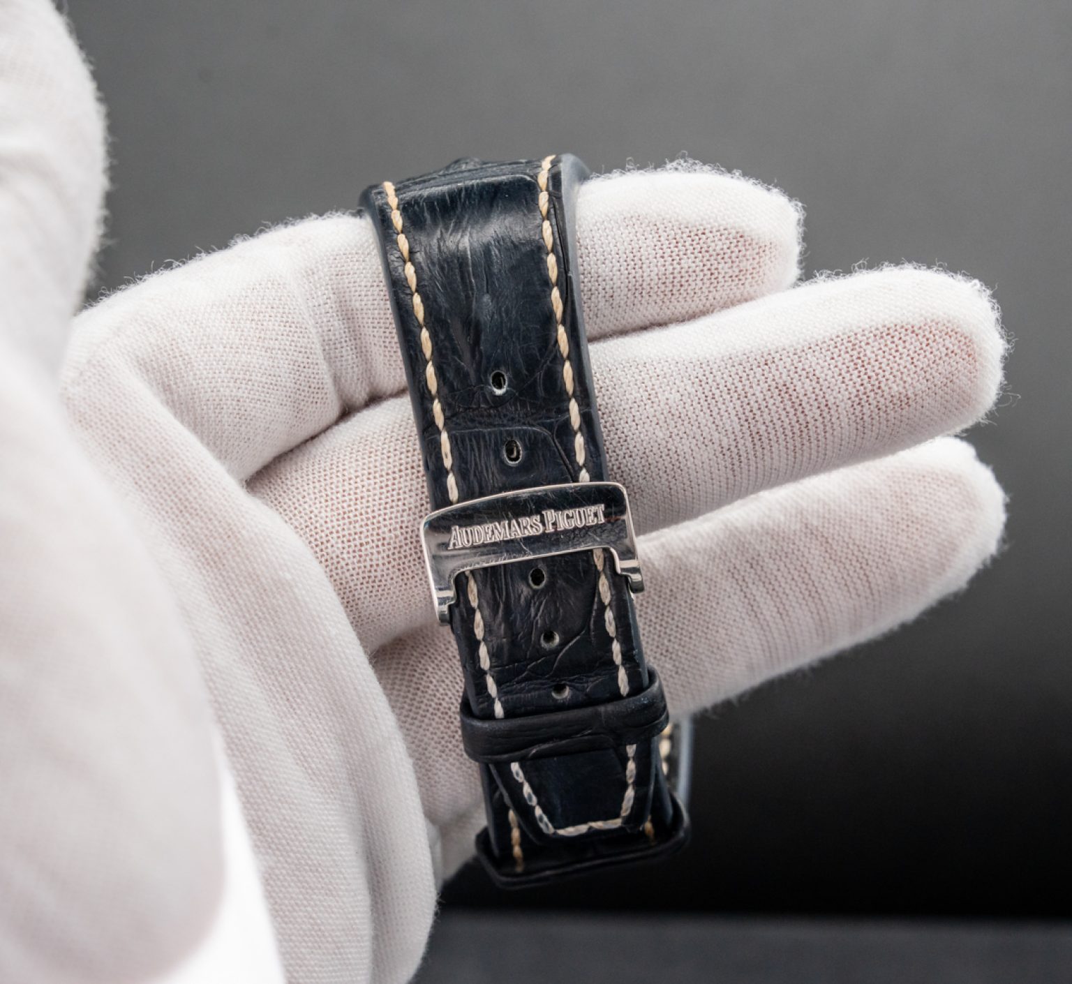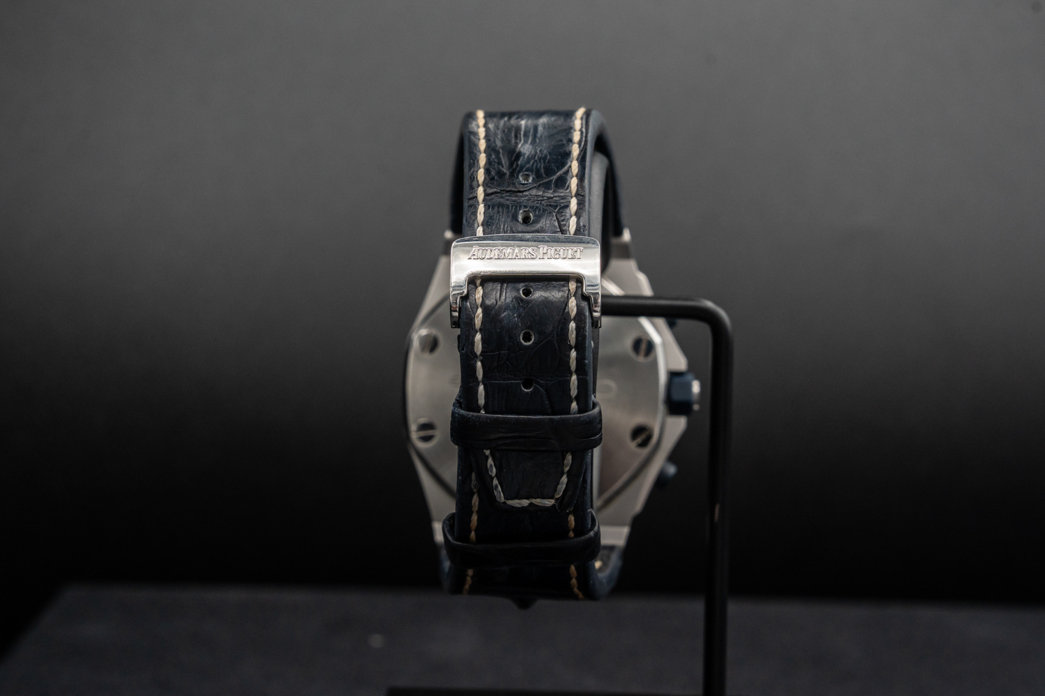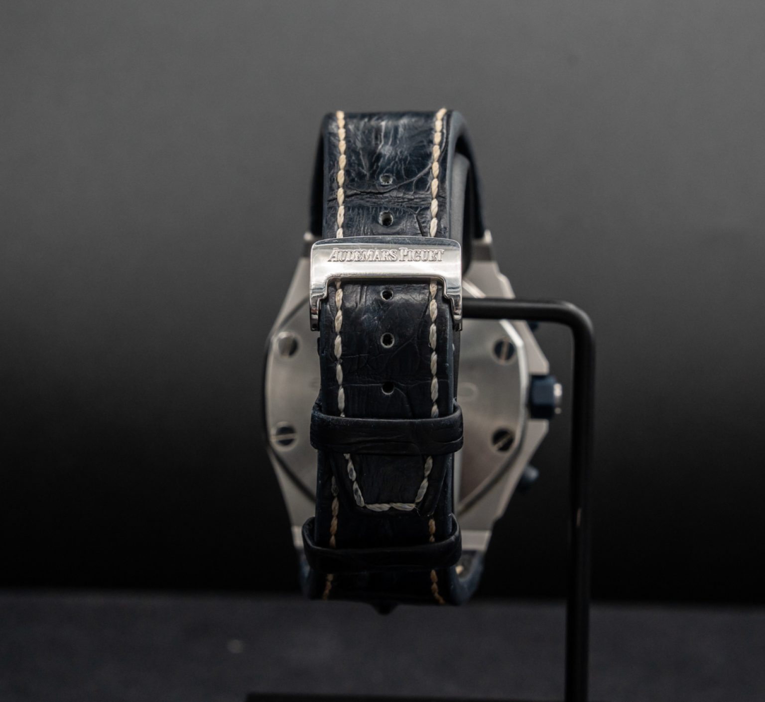 The Audemars Piguet Royal Oak Offshore Chronograph 26170ST.OO.D305CR.01 is a bold icon of performance and prestige. Crafted in robust stainless steel, its 42mm case showcases the unmistakable Royal Oak design with a brushed finish and exposed screws — a symbol of strength and refinement. The silver-toned dial contrasts elegantly with deep blue subdials and bold Arabic numerals, combining sport-driven functionality with timeless aesthetics. Powered by the self-winding Calibre 3126/3840, it offers chronograph precision, a date display, and up to 50 hours of power reserve. The blue alligator leather strap enhances its distinctive personality, adding a touch of luxury to its dynamic appeal. This is not just a watch — it’s a statement for those who lead with confidence, value legacy, and live life at full speed. The Royal Oak Offshore is where power meets elegance, and this reference is its ultimate expression.