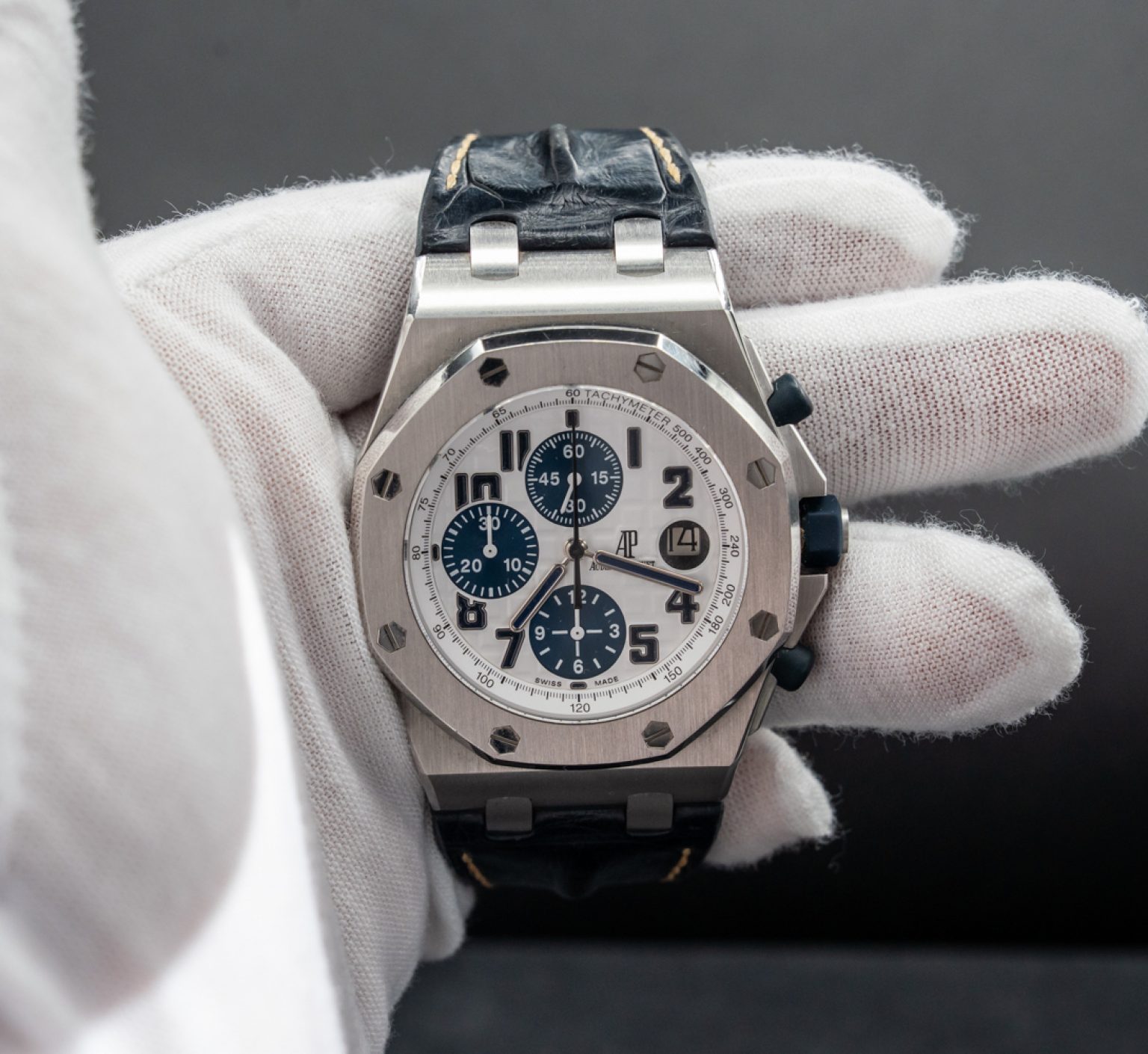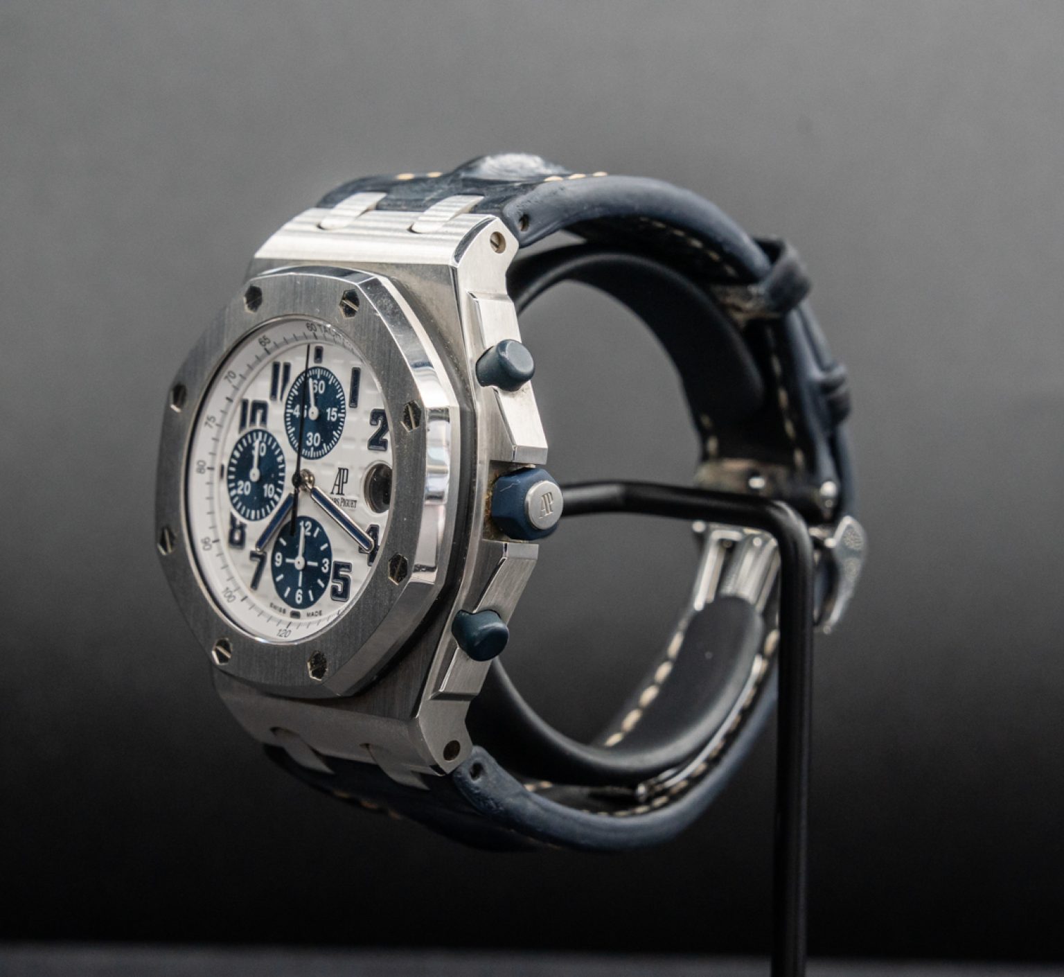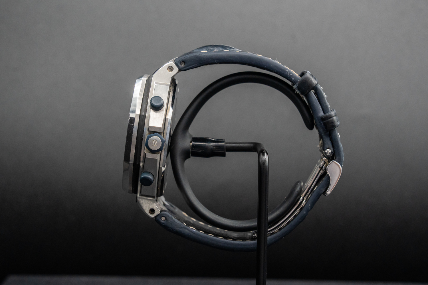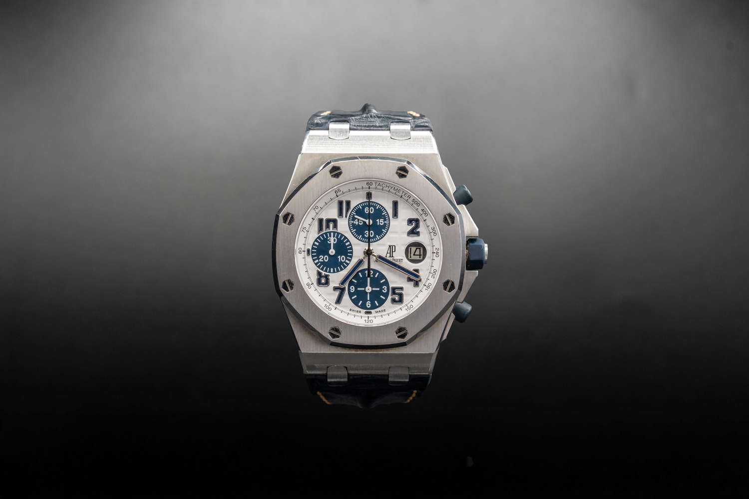 The Audemars Piguet Royal Oak Offshore Chronograph 26170ST.OO.D305CR.01 is a bold icon of performance and prestige. Crafted in robust stainless steel, its 42mm case showcases the unmistakable Royal Oak design with a brushed finish and exposed screws — a symbol of strength and refinement. The silver-toned dial contrasts elegantly with deep blue subdials and bold Arabic numerals, combining sport-driven functionality with timeless aesthetics. Powered by the self-winding Calibre 3126/3840, it offers chronograph precision, a date display, and up to 50 hours of power reserve. The blue alligator leather strap enhances its distinctive personality, adding a touch of luxury to its dynamic appeal. This is not just a watch — it’s a statement for those who lead with confidence, value legacy, and live life at full speed. The Royal Oak Offshore is where power meets elegance, and this reference is its ultimate expression.