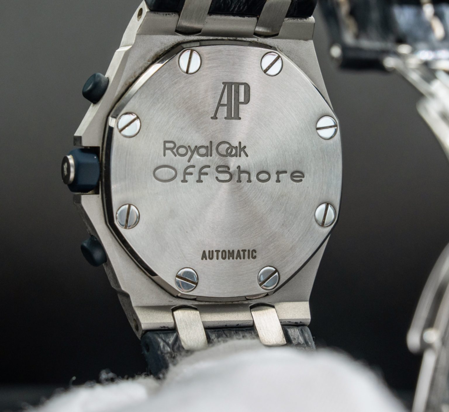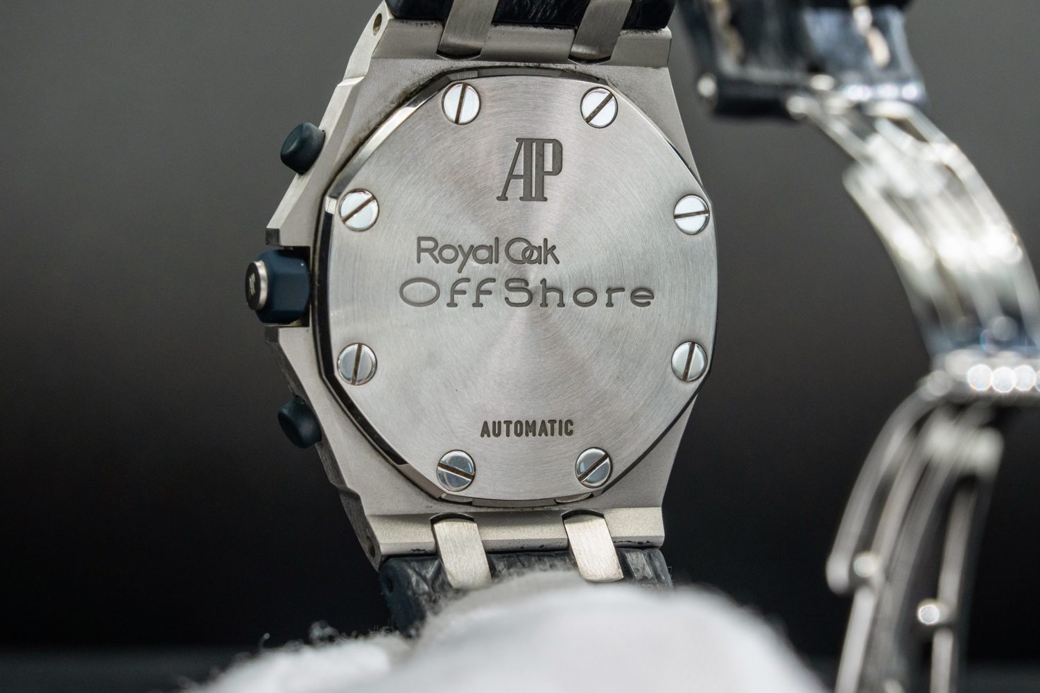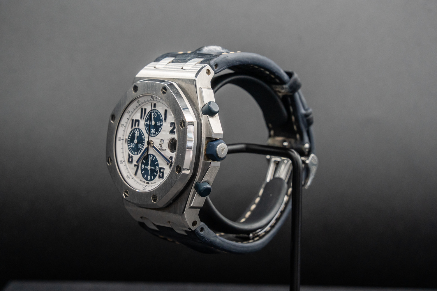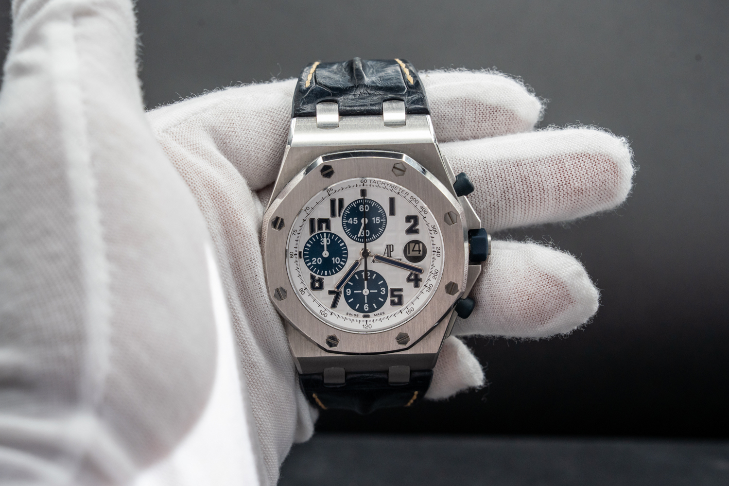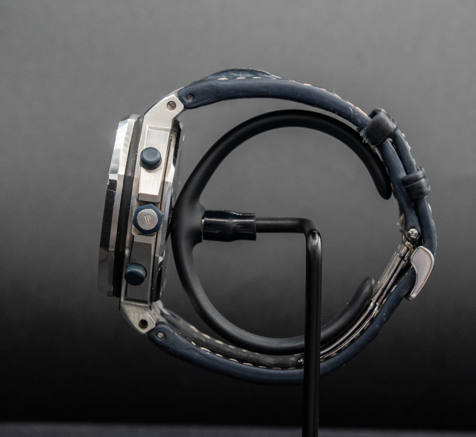 The Audemars Piguet Royal Oak Offshore Chronograph 26170ST.OO.D305CR.01 is a bold icon of performance and prestige. Crafted in robust stainless steel, its 42mm case showcases the unmistakable Royal Oak design with a brushed finish and exposed screws — a symbol of strength and refinement. The silver-toned dial contrasts elegantly with deep blue subdials and bold Arabic numerals, combining sport-driven functionality with timeless aesthetics. Powered by the self-winding Calibre 3126/3840, it offers chronograph precision, a date display, and up to 50 hours of power reserve. The blue alligator leather strap enhances its distinctive personality, adding a touch of luxury to its dynamic appeal. This is not just a watch — it’s a statement for those who lead with confidence, value legacy, and live life at full speed. The Royal Oak Offshore is where power meets elegance, and this reference is its ultimate expression.