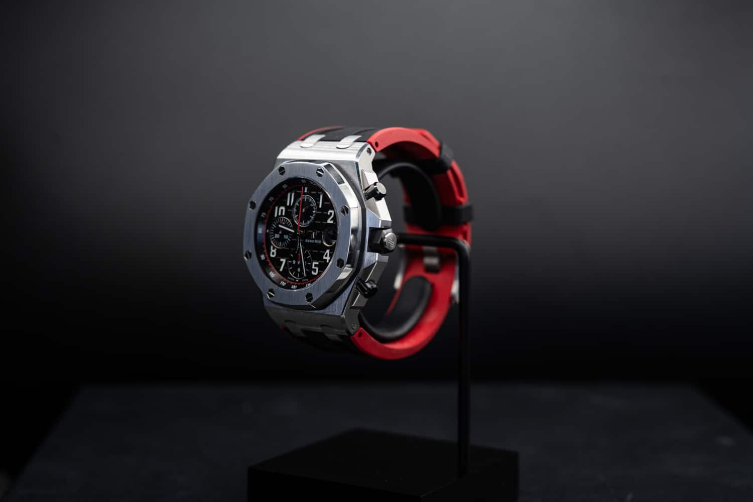 Unleash the spirit of motorsport with the Audemars Piguet Royal Oak Offshore Chronograph – a bold timepiece that fuses cutting-edge design with technical mastery. Featuring a robust 44mm stainless steel case, red racing-inspired accents, and the iconic octagonal bezel, this chronograph is built for those who lead with precision and power. The black rubber strap with red detailing adds a sporty edge, while the automatic movement ensures peak performance. A watch made to stand out – both on the wrist and on the road.