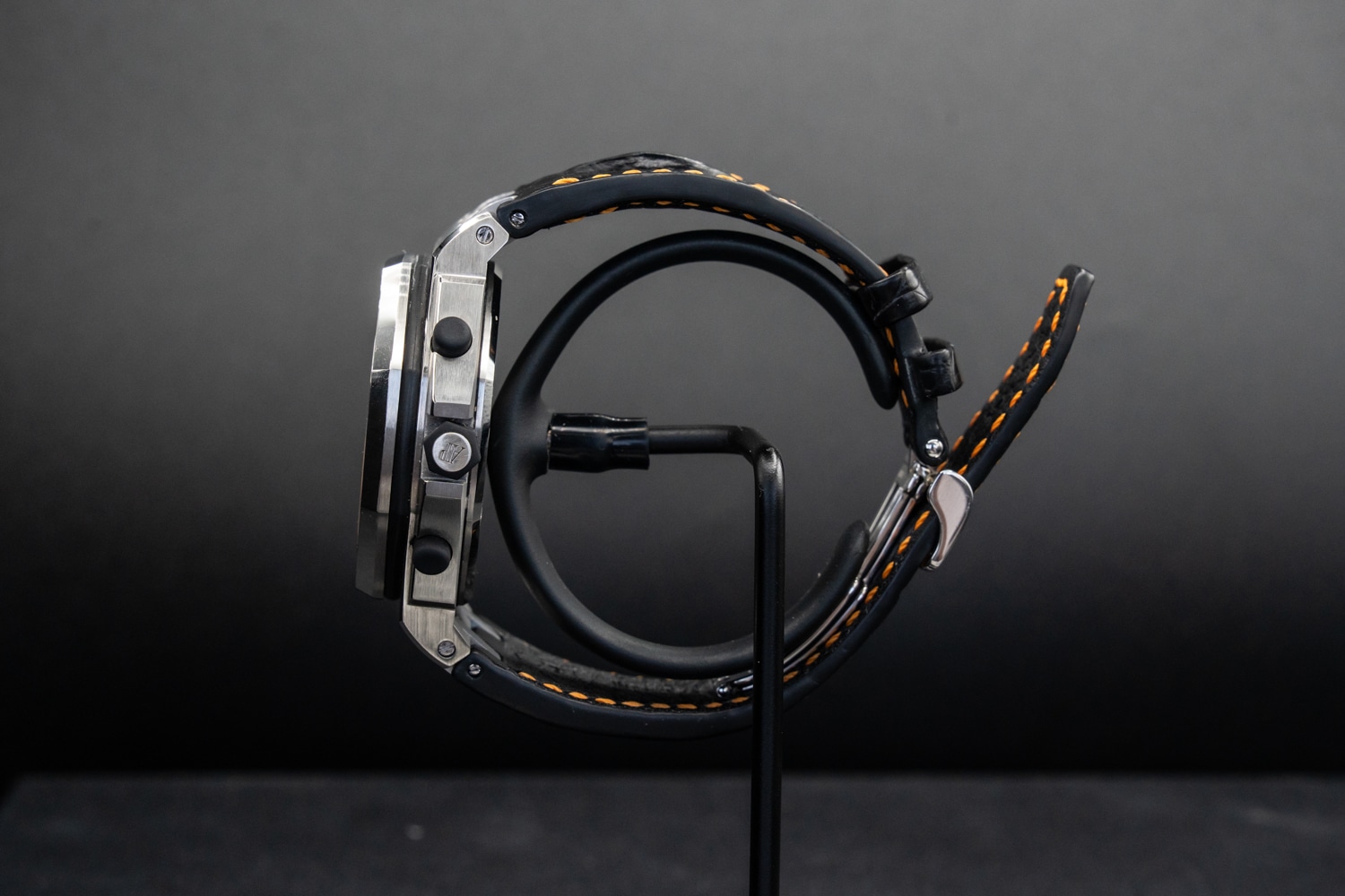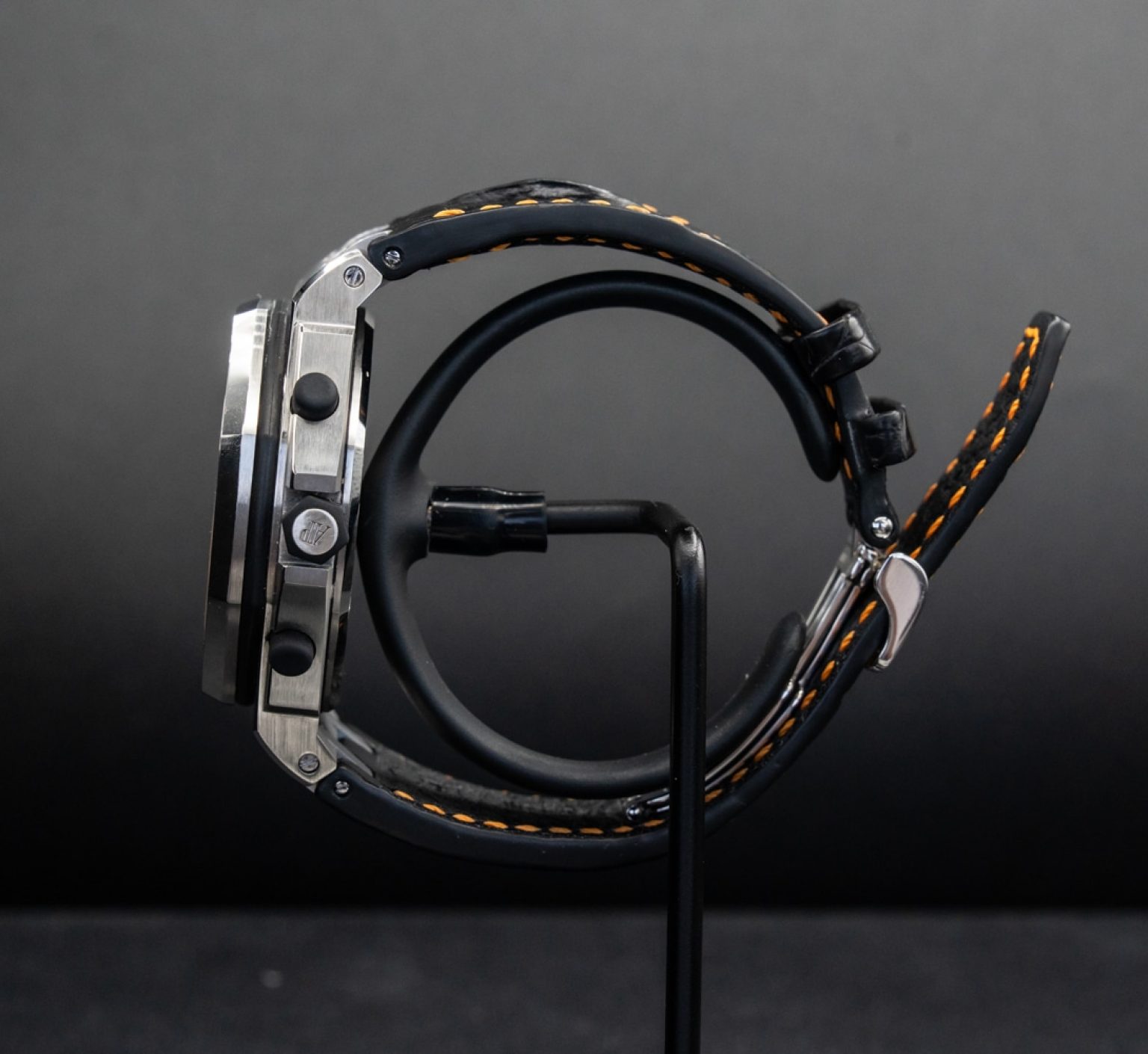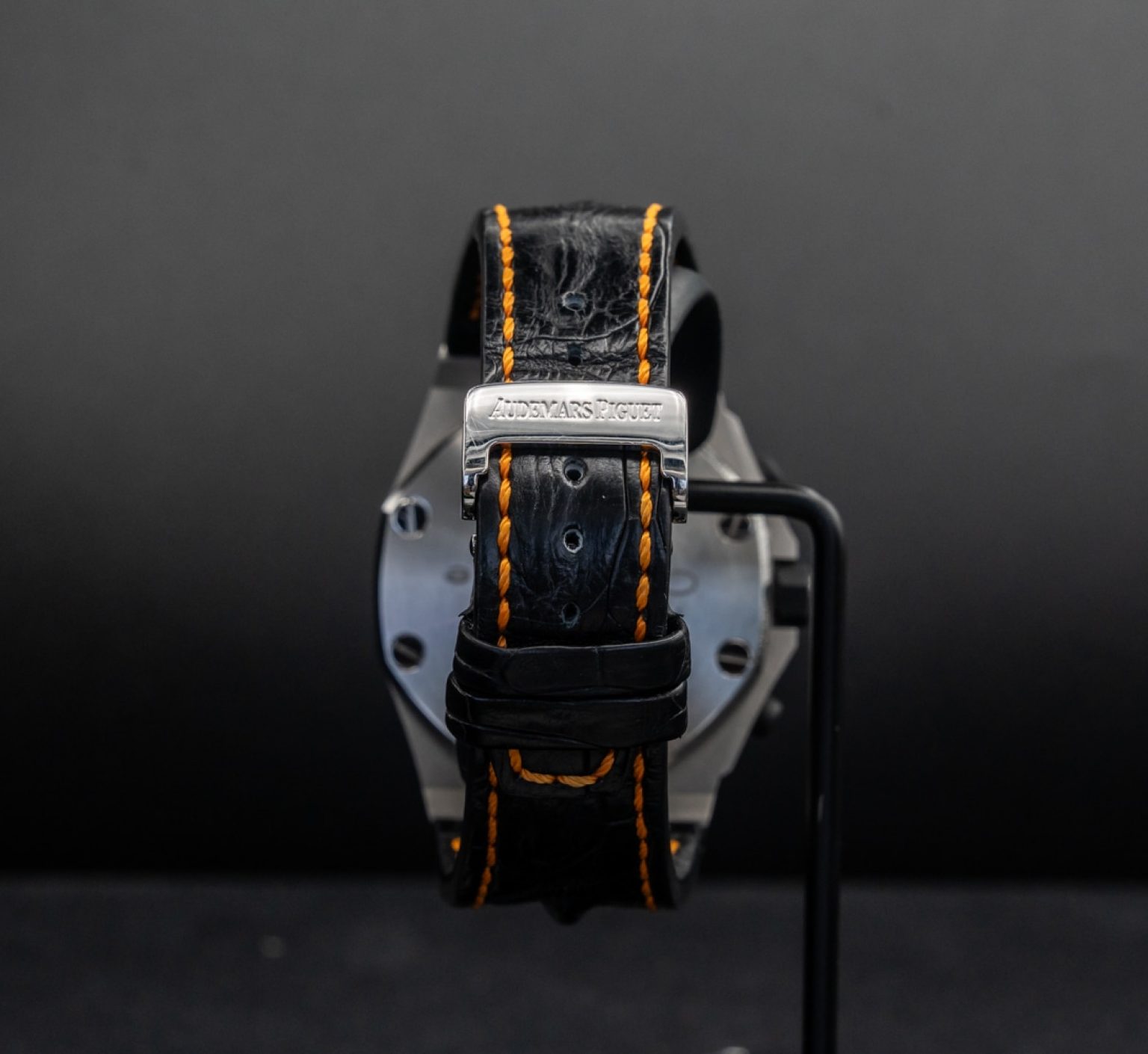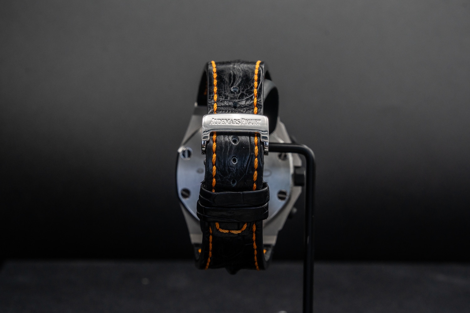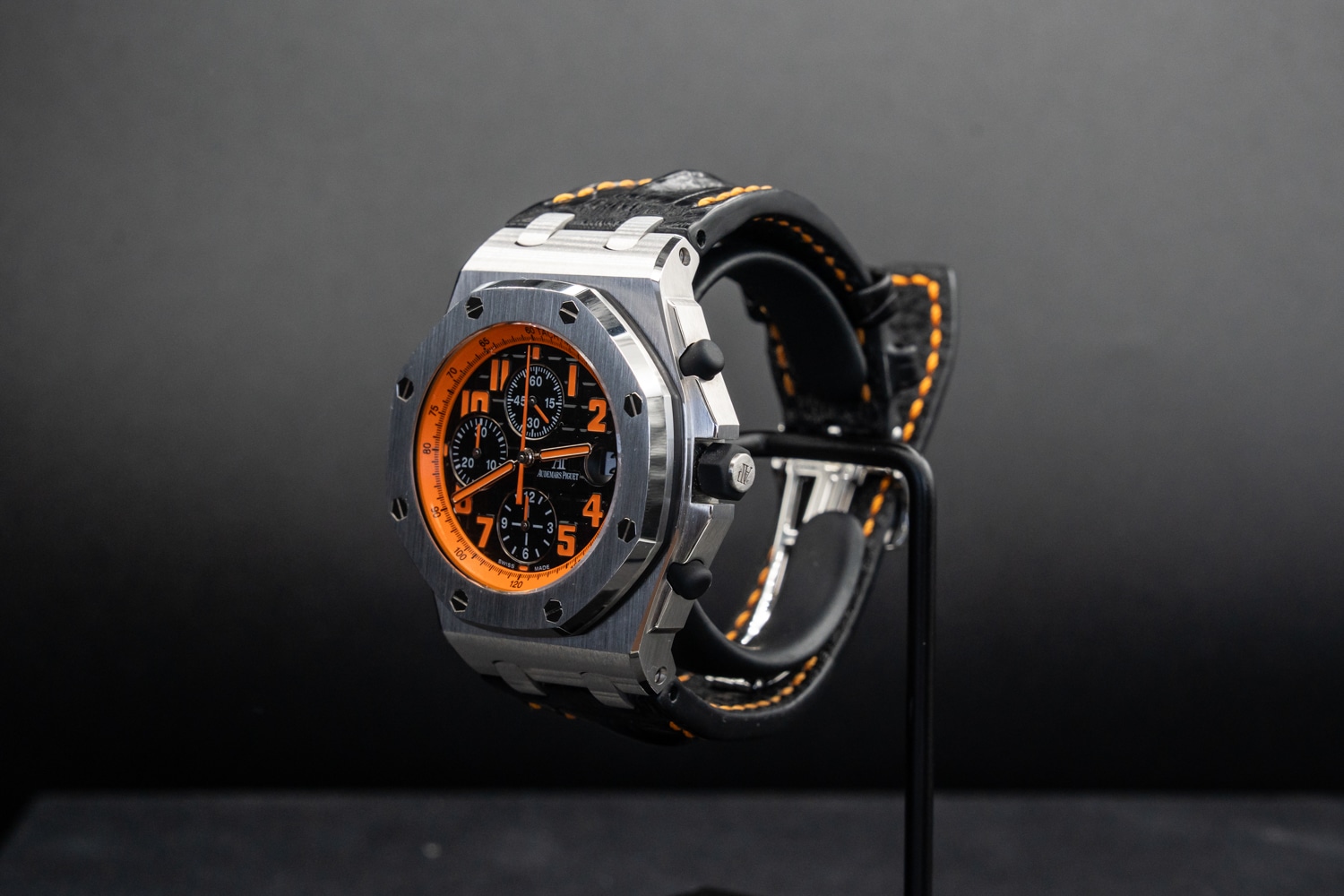 Strap: Black leather with orange stitching and steel pin buckle